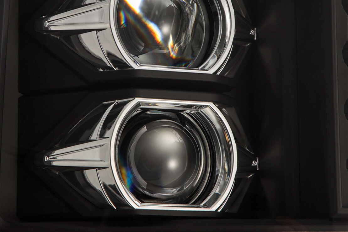 AlphaRex Design Alpharex developed these Ford Super Duty Luxx-series headlights based on its stock design and added a LED tube around the edge as DRL and sequential turn signal. At the side of these Ford Super Duty Luxx-series headlights is the amber reflector lens, and there are amber halogen light bulbs at the side for turn signal light as well. The headlights also come with the activation light feature, which is an animated running light when you unlock your Ford Super Duty. The outer projector is for low beam, while the inner projector is for high beam. The headlights are using LED chips, developed by AlphaRex directly, to produce the light output for low beam and high beam.