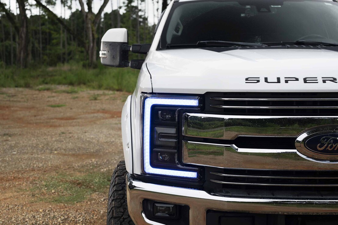 The XRGB LED headlights for the 2017-2019 Ford Super Duty are here! Offering virtually endless color options via the Morimoto XBT Bluetooth app, the DRL can be configured to shine any color you choose! When the turn signals are used, the amber function overrides the DRL, then returns to the chosen color once turned off. Performance is vastly improved over stock too, with dual LED projectors providing plenty of output for your nighttime drive. The gloss black design of the headlights provides a custom look even when off. These slick XRGB headlights are backed with a 5-year warranty supported by our team in Atlanta.
