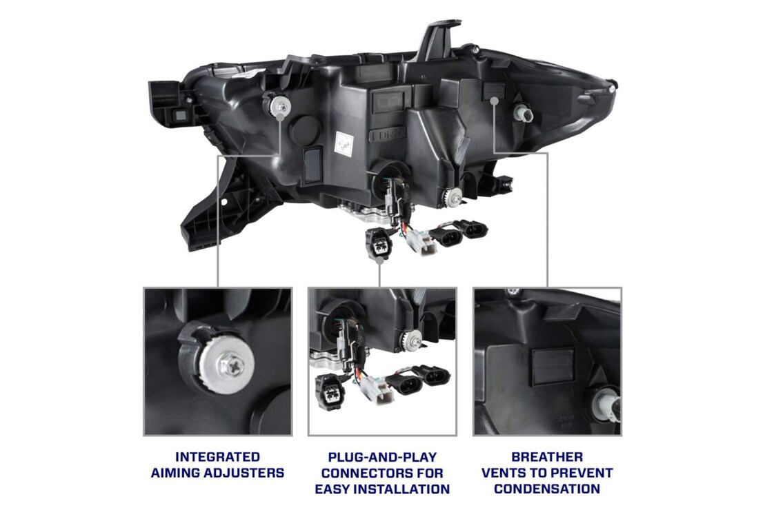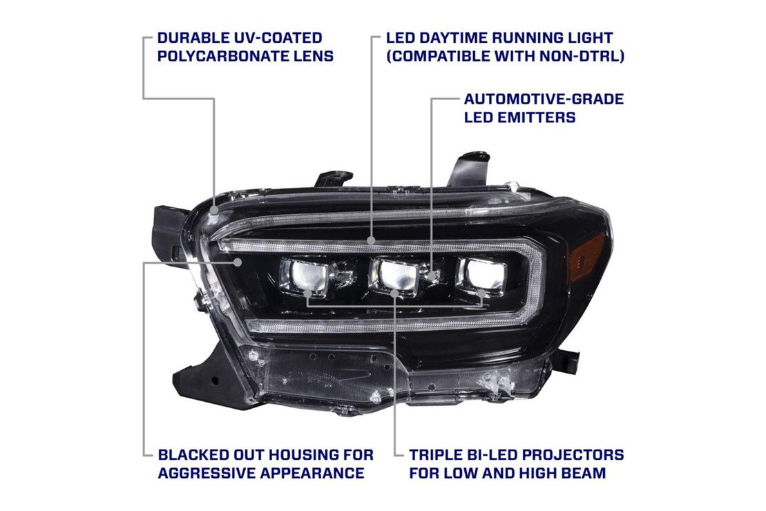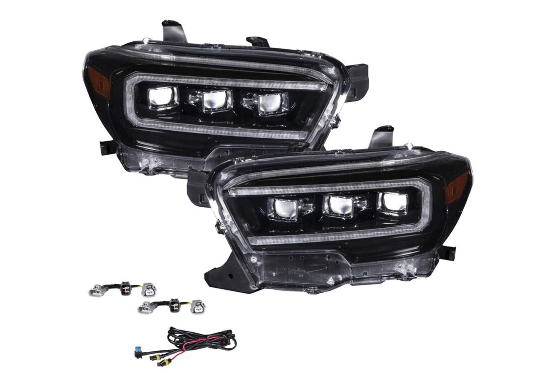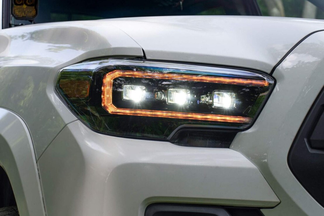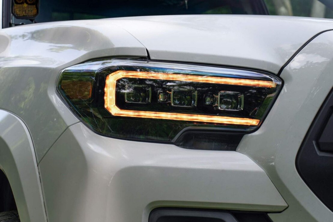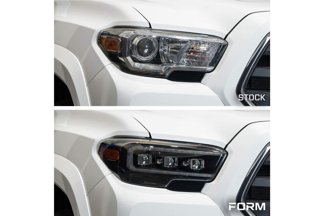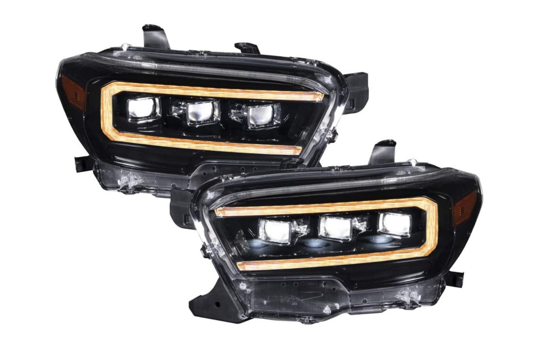 Overview: Your vehicle deserves an upgrade and Sequential LED Headlights compatible with Toyota Tacoma 2016-2023 from Form Lighting are the perfect way to do it. These premium OE-grade replacements add triple bi-LED projectors sequential turn signals a startup sequence a more aggressive blacked-out appearance and now feature a selectable white or amber running light.