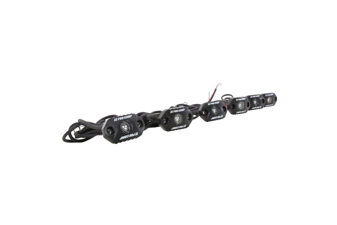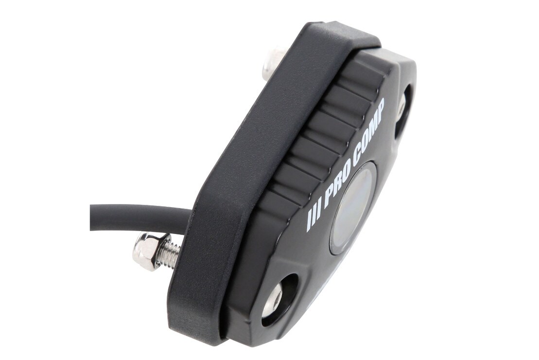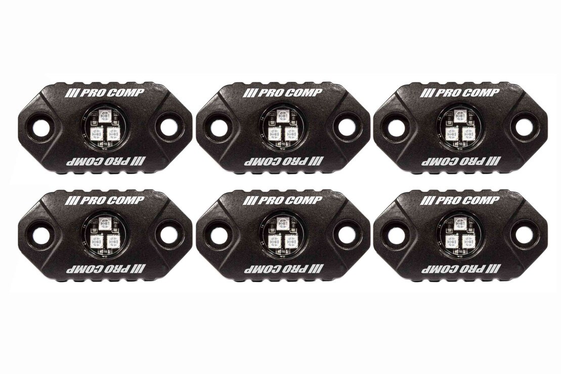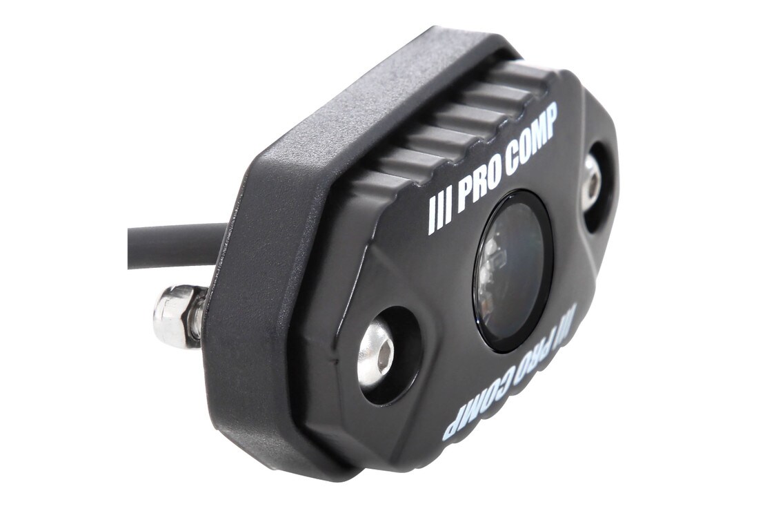 Designed with the off-roader in mind, Pro Comp's new rock lights utilize waterproof aluminum LED housings for safe and reliable performance in all weather conditions. Each of the six RGB rock lights is fitted with 3x 3W CREE RGB LEDs with long leads to allow you to mount the LEDs in a variety of locations depending on your application for greater visibility. Includes hardware and wiring instructions.