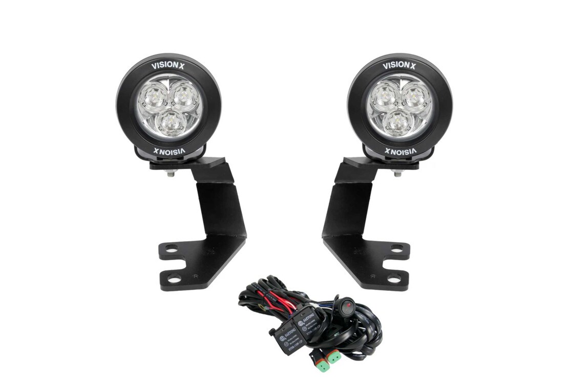 10-23 Toyota 4Runner A-Pillar Light Kit: The Vision X A-Pillar Kit is the perfect lighting solution for your Toyota 4Runner. This no-drill, bolt on lighting kit features optional 3.7in or 4.7in CG2 Light Cannons that will add a massive 4,500 lumens of forward facing light to your vehicle in minutes. Utilizing the factory mounting locations, the powder coated steel brackets simply slide under your hood and are secured using the OEM hardware. The kit includes everything you need to install your lights which includes our two light wiring harness with relays and a rocker switch.