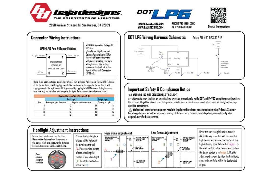 Upgrade your ride with the Baja Designs DOT LP6, their first-ever road-legal LED headlight replacement. Built on the foundation of the race-proven LP6 Pro off-road light, the DOT LP6 is engineered for on-road use and fully compliant with FMVSS 108 standards for both automotive and motorcycle applications. This premium LED headlight offers integrated high and low beam functions, delivering exceptional performance and reliability on any road. Choose between white or amber daytime running lights to customize your vehicle's look. With universal and vehicle-specific mounting options, the DOT LP6 provides a perfect fit for your setup. Backed by Baja Designs' 30-Day Satisfaction Guarantee and Lifetime Limited Warranty, the DOT LP6 is the ultimate combination of rugged durability, style, and DOT road-legal usability.