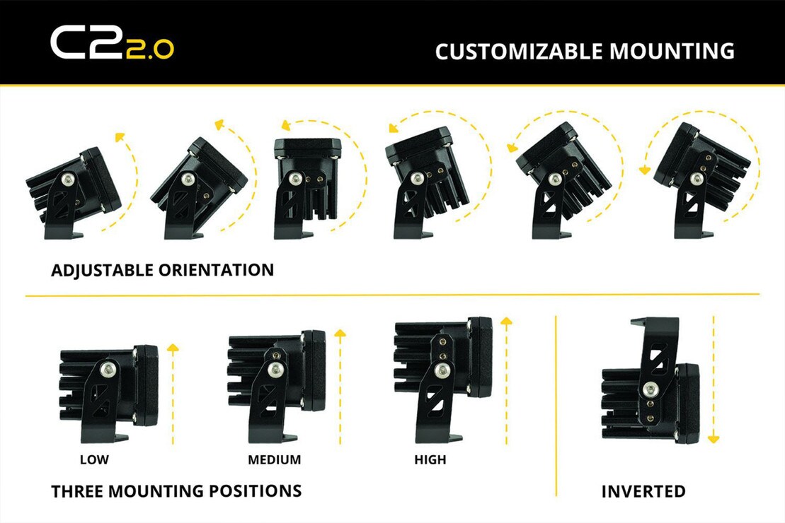 Customizable Mounting The C2 2.0 LED pod features three mounting points to adjust the pod’s height. The revised mounting bracket also allows for even more adjustment to the angle of the pod for a more dialed-in setup.