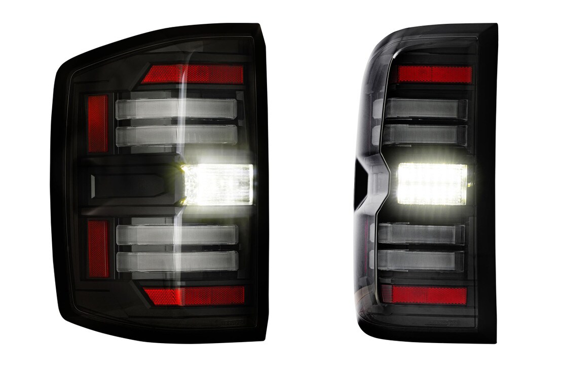 Style: Dropping in some rear-facing LED Chips would have been much easier and far less expensive to produce... and while thats what every other brand to date has done, thats not how we roll. Instead, these have a much more modern look found on the latest generation Sierra Dually trucks. Two horizontal rows of TIR-Optics illuminate the 3D light blades that float across the front of the lenses. These serve as the brake light and turn signal, and they're extremely bright--easily visible both day and night. Pair that with the surrounding muscular trim, optional smoked or red outer lens, and we've easily got what is the best-looking set tail lights on the road for the Silverado.